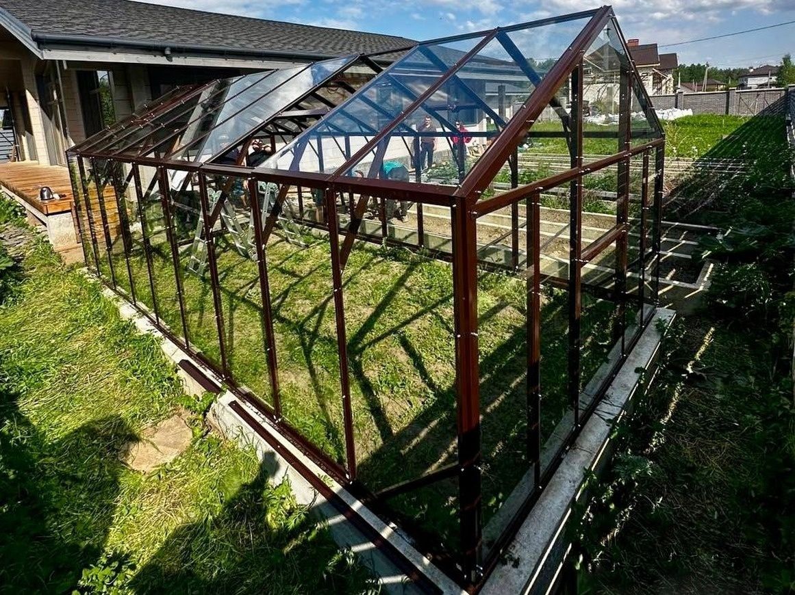 Стеклянное покрытие обеспечивает максимально естественное освещение растений и способствует равномерному распределению света внутри теплицы. Это положительно влияет на фотосинтез и развитие культур.